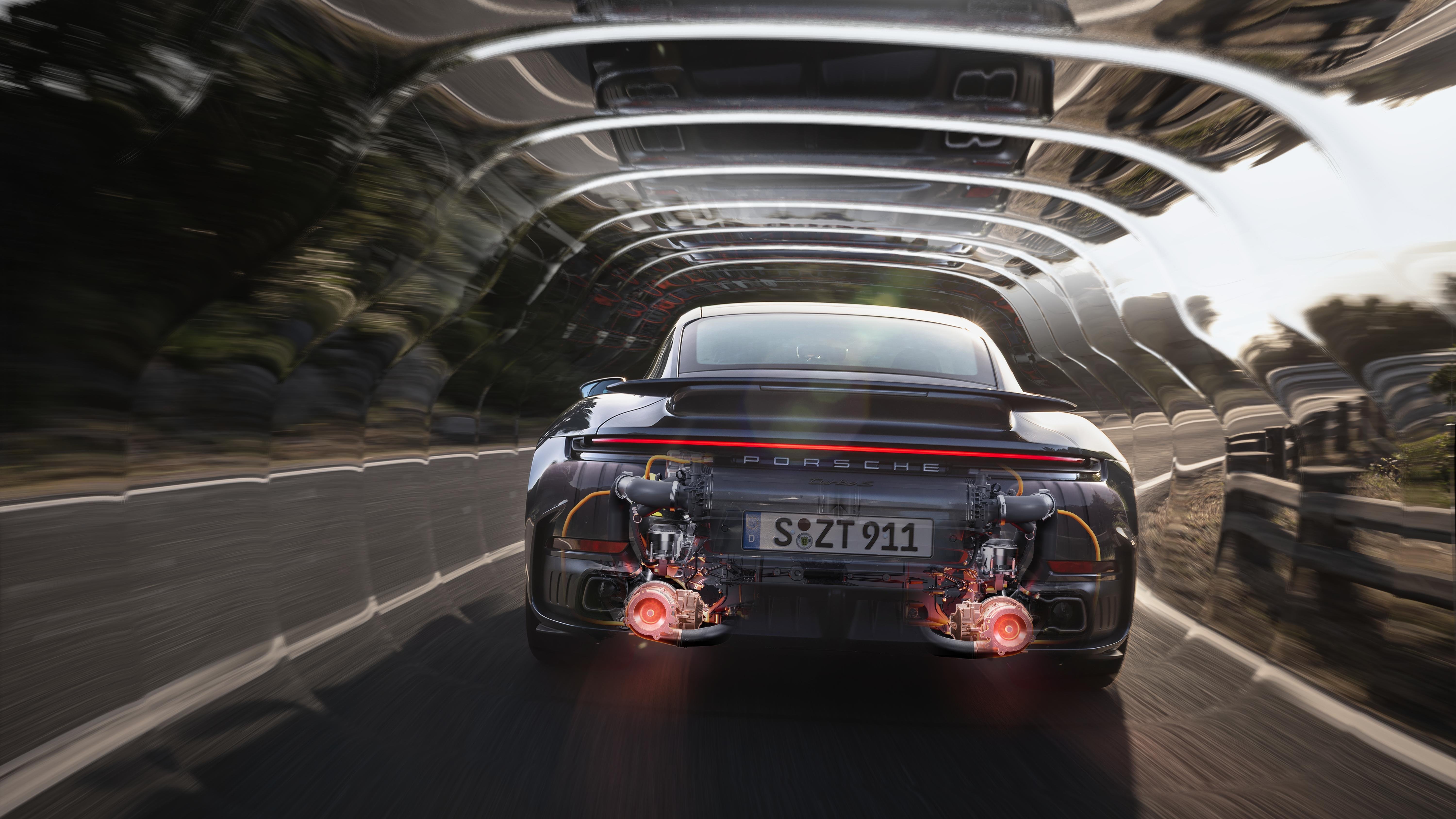Решението за използването на 3,6-литров двигател при Carrera GTS може да се обясни и с факта че тази машина задвижва и новия Turbo S, тоест още при създаването си е била предвидена и за по-големи натоварвания. VTG системата от скъпи сплави е отпадала и логиката на развитие е подобна на тази на при GTS, но нещата се случват в „малко“ по-големи мащаби. Заради увеличената спрямо 911 GTS мощност, респективно налягане на пълнене са използвани други (усилени) бутала осигуряващи намаляване на степента на сгъстяване от 10,5:1 на 9,2:1. В сравнения с предишния мотор 3,7-литров мотор на Turbo S, сам по себе си новият има същата мощност от 640 к.с. с въртящ момент от 760 Нм (800 Нм при предишния) в близък работен диапазон. При отчитане на цялата системна мощност обаче нещата значително се променят. Тъй като двете електрически машини на турбините имат над двоен капацитет за регенериране (28 кВт срещу 11 кВт) и са гарант за по-голям капацитет за зареждане на батерията е увеличена до 60 кВт (80 к.с.) мощността на електрическия тягов мотор. Това води до по-голямо натоварване на батерията, а агрегатът, чиито въртящ момент е нараснал до 188 Нм осигурява системна мощност от 711 к.с. в диапазона 6500-7000 об./мин. Той има същия въртящ момент от 800 Нм, но в много по-широк диапазон от 2300 об./мин до 6000 об./мин (2500 об./мин – 4000 об./мин на досегашния) и много по-високи стойности извън него. Дори и при по-високото работно налягане и температура принципът да работа с λ=1 е валиден и тук.