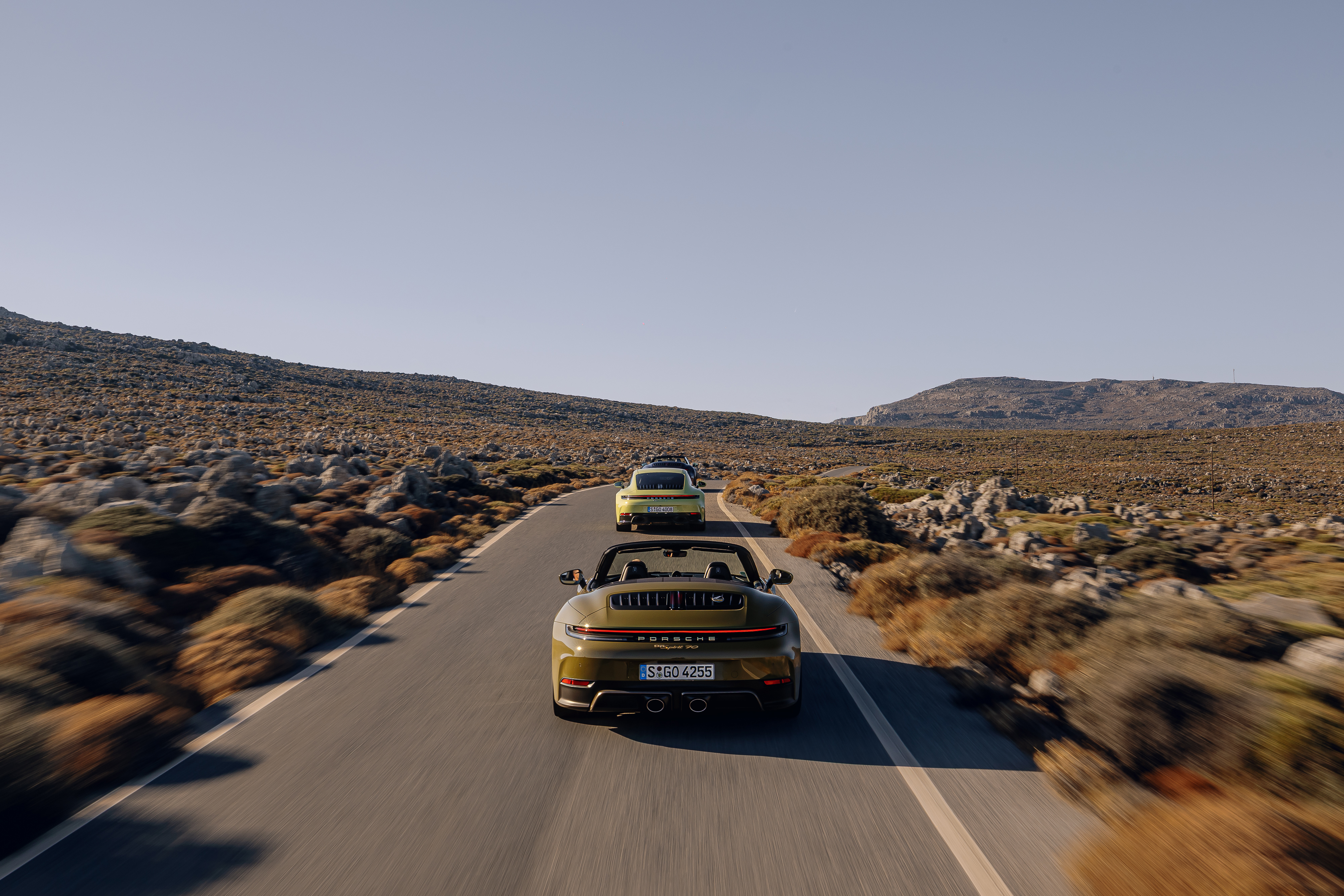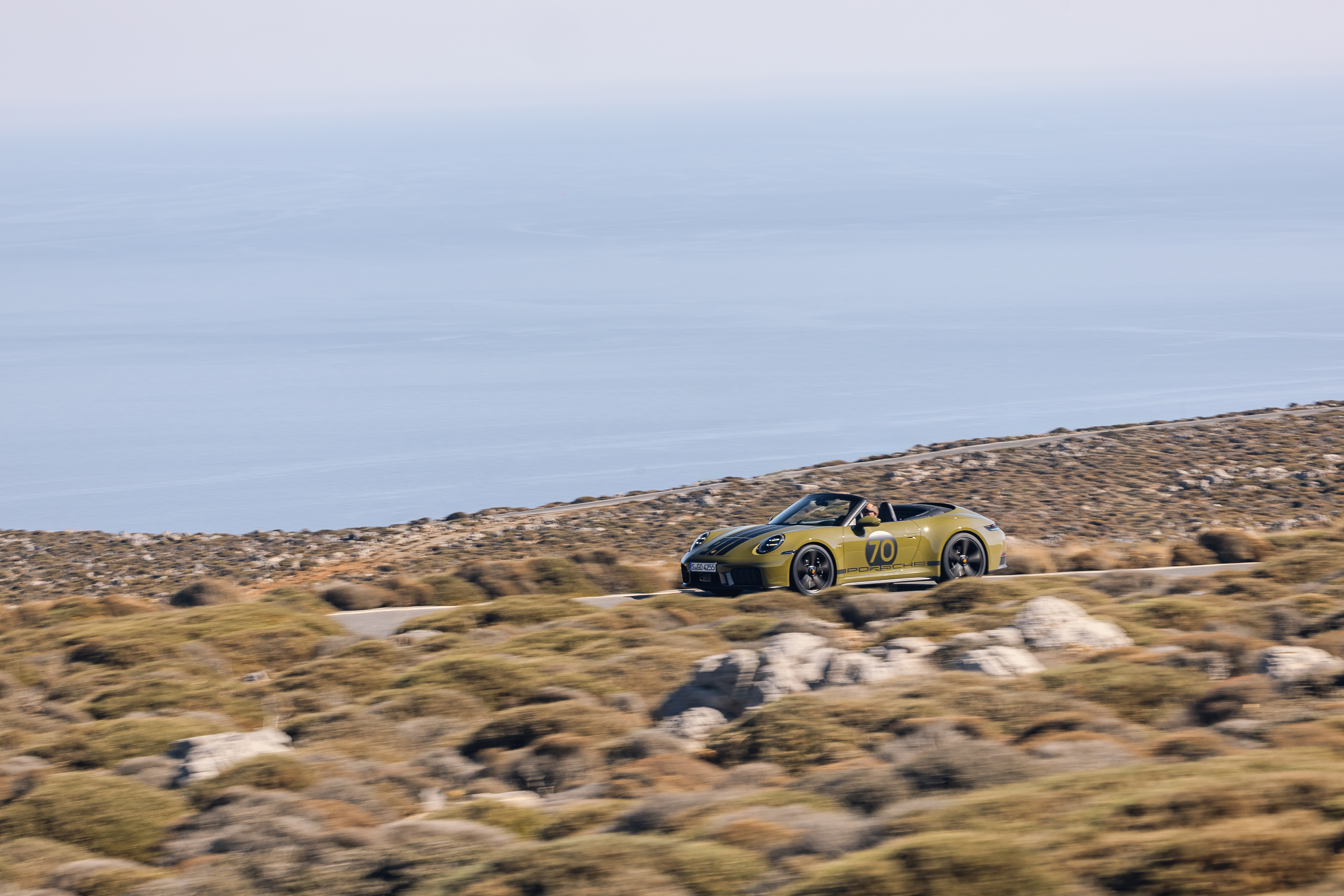 Освен всичко друго е добре да спомена, че тук не става дума точно за GTS, а за уникалния модел Spirit 70, който всъщност е Cabriolet и ще бъде произведен в едва 1500 броя и със своя специално създаден наситен зелен цвят Olive Neo цвят визуално носи детайли в духа на 70-те години. Само със задно предаване той е придобил собствена визия с помощта на множество уникални детайли и колелата Sport Classic с дизайн “Fuchs”, които също са боядисани в този сиво-златен цвят. Мекият покрив е черен, а това подчертава уникалното визуално присъствие на 911 Spirit 70. Върху предния капак преминават три декоративни ивици в черен копринен гланц. Този детайл напомня на стикерите за безопасност от 70-те години на миналия век – по това време шофьорите на спортни автомобили поставят надлъжни ивици върху каросерията на своите бързи автомобили, така че те да се виждат по-лесно в огледалото за обратно виждане при високи скорости по магистралата или на състезателна писта. На предния капак е разположен почти идентичен с историческия герб от 1963 г., а предните калници са увенчани със златисти емблеми „Porsche Exclusive Manufaktur“. Отделен знак Porsche Heritage е разположен на решетката на капака на двигателя. Дизайнът му напомня на знака на Porsche 356, който е бил поставян на модела през 50-те години на миналия век, когато автомобилът е достигал границата от 100 000 километра пробег. Има още множество необичайни детайли, които са в основата на доста високата цена на модела, но и гаранцията за високата стойност при продажба. Акцентът в интериора е емблематичният плат с десен Pasha в black/olive neo, чийто графичен дизайн напомня на веещо се карирано знаме, с различни по големина правоъгълници създаващи усещане за движение в шарката.