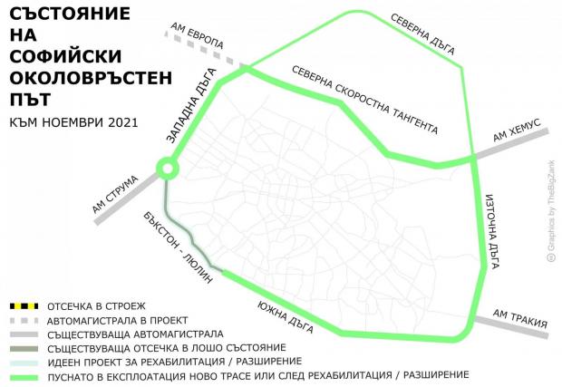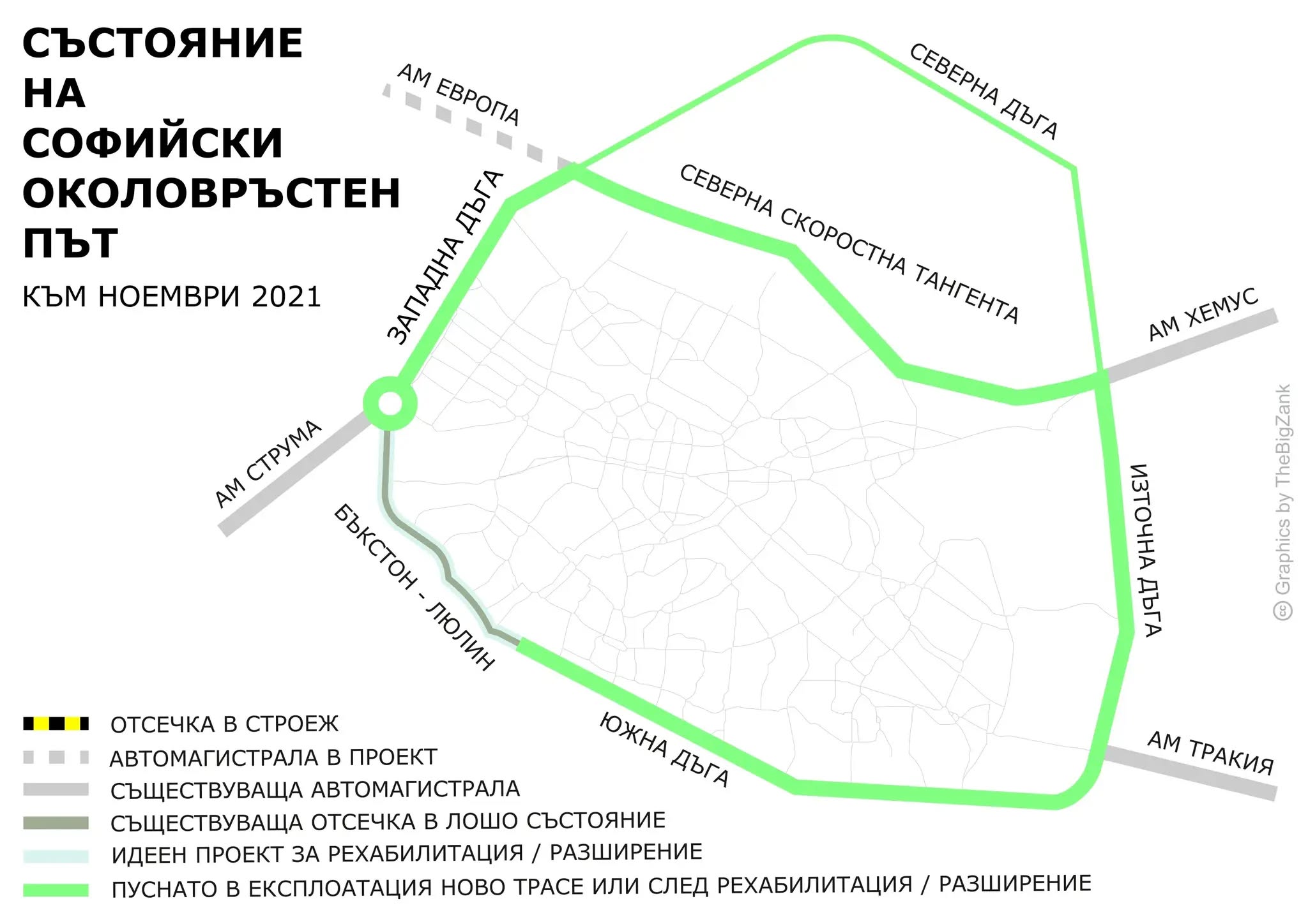 Преди дни АПИ пое ангажимент последният недовършен участък от околовръстния път на София да започне да се строи до средата на 2027 г. Строителството ще струва 2,1 млрд. лева. Оставащите 8 км ще се строят на два етапа – 6 км от Люлин до бул. “Цар Борис III” и 2 км от бул. “Цар Борис III” до Бъкстон, като вторият лот включва и тунел.