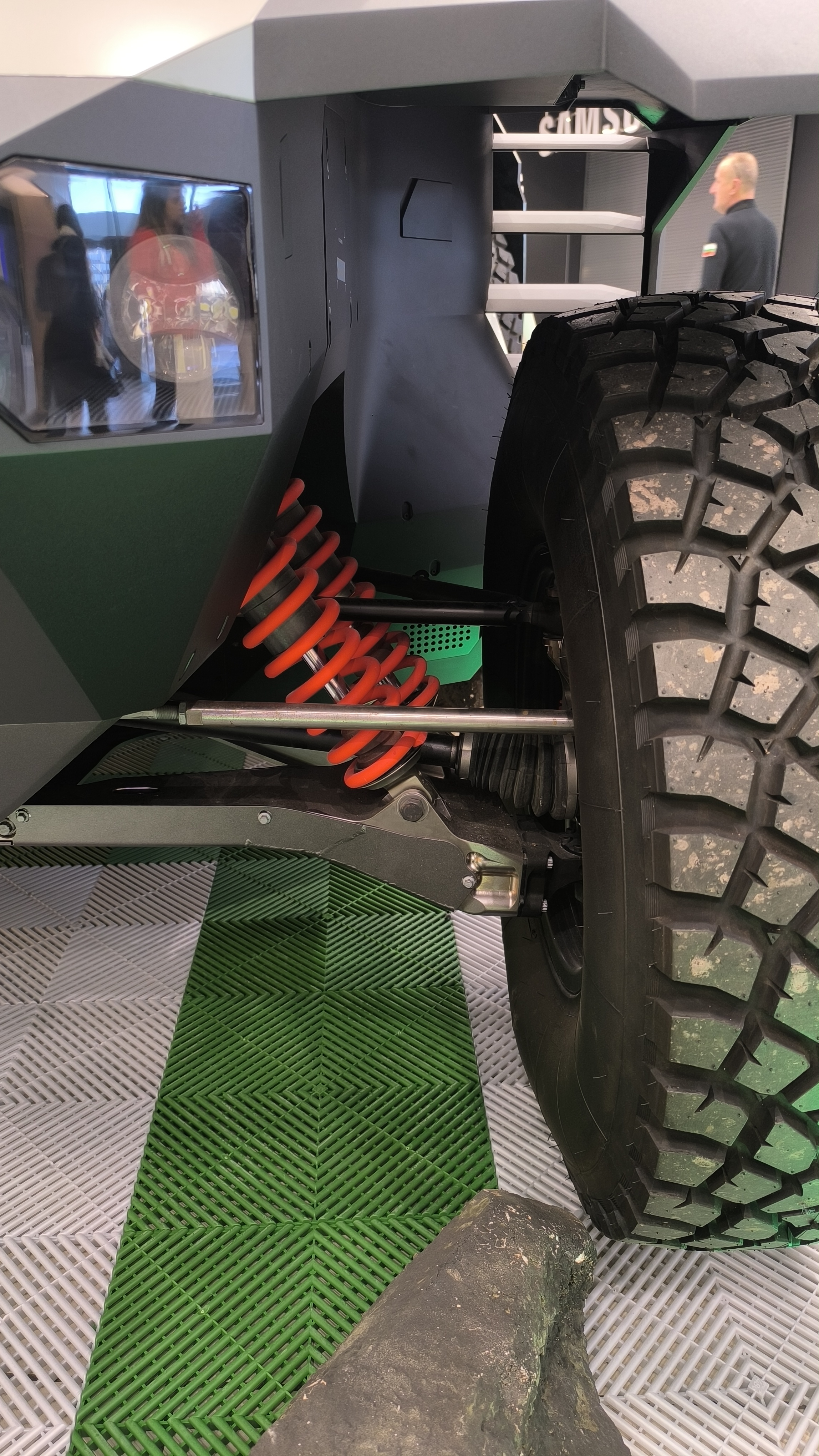 Автомобилът стъпва на 17-инчови алуминиеви джанти с офроуд гуми BF Goodrich с диаметър 37 инча. Габаритите – дължина 4 140 мм, ширина 2 290 мм и височина 1 810 мм, с междуосие 3 000 мм – са максимално използвани в рамките на регламента, за да осигурят стабилност и място за резервни гуми и оборудване.