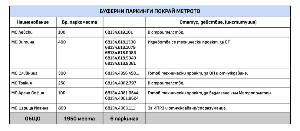 Ключови обаче ще бъдат приходите от новите два пъти по-скъпи зони. Новите паркинги ще бъдат два типа – етажни (три в центъра и множество в отдалечените квартали) и буферни паркинги в близост до метростанциите. Буферните паркинги ще бъдат шест с общ капацитет от 1950 места. Два вече се строят – при метростанциите “Левски” (100 паркоместа) и “Тракия” (250 паркоместа). Най-големият паркинг ще бъде при Окръжна болница – с цели 800 места. Този при зала Арена София ще бъде доста по-малък – със 100 места.