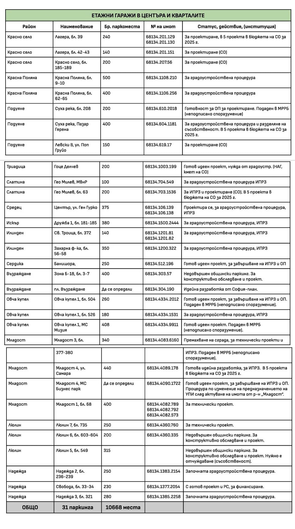 Кварталните паркинги може да видите в таблицата по-долу. Най-много ще има в Люлин, Надежда, Овча Купел и Младост – по три. Много от тях са с готови идейни проекти и предстои проектиране. Най-големият ще е в Красна поляна – за 500 коли.
