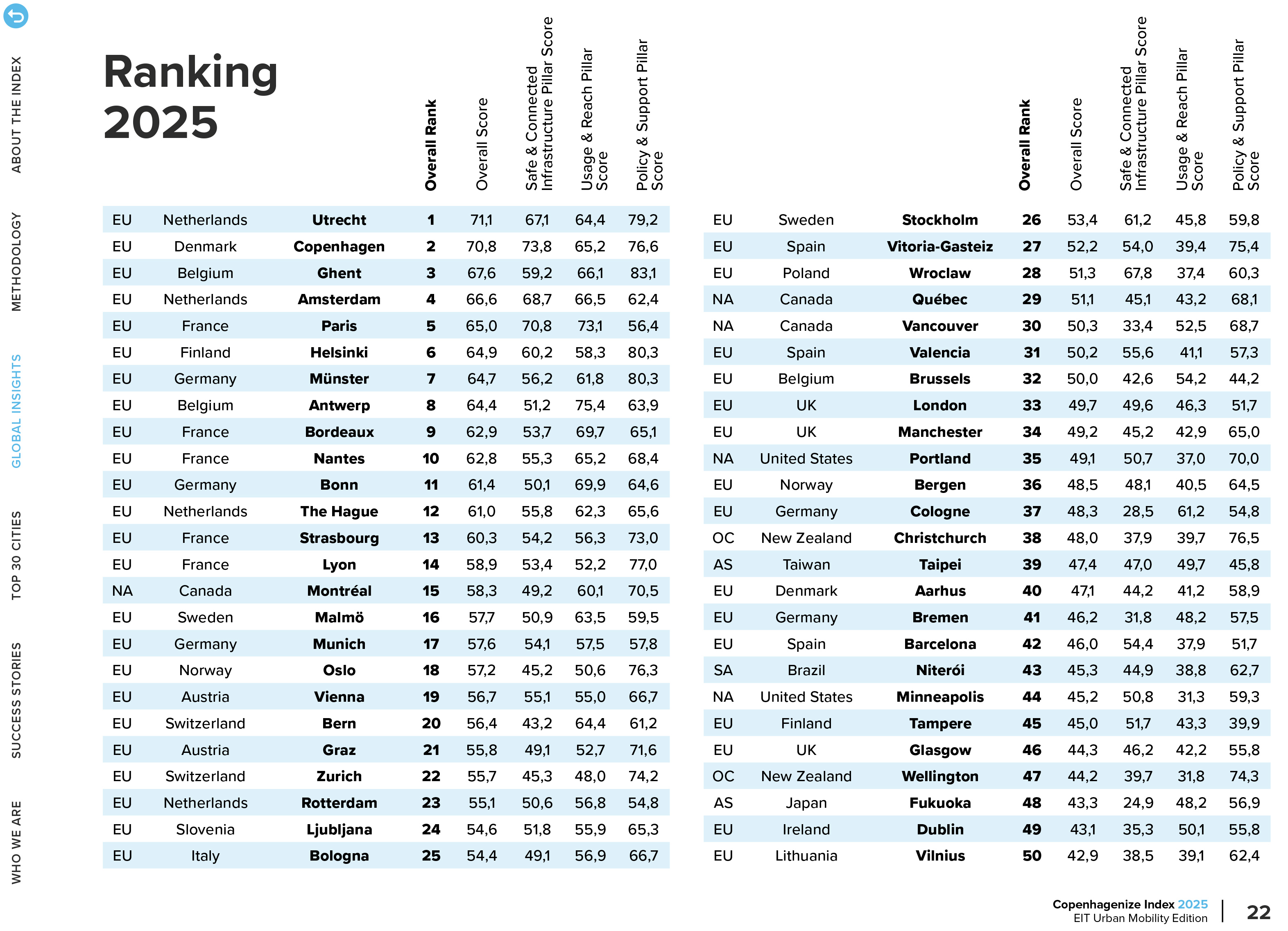 Най-добрият град за колоездачи в света е Утрехт (Нидерландия), следван от Копенхаген (Дания) и Гент (Белгия). В топ 5 са още Амстердам (Нидерландия) и Париж (Франция). Най-напред от градовете извън Европа е Монреал (Канада) – на 15-о място. Единственият присъстващ балкански град е сръбският Нови Сад – на 84-о място.
