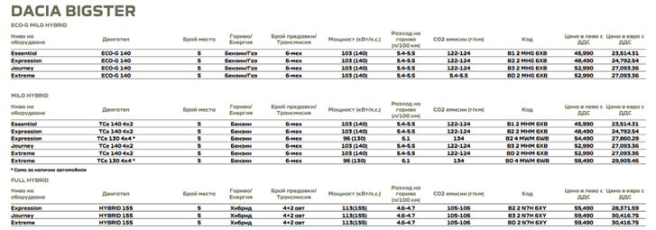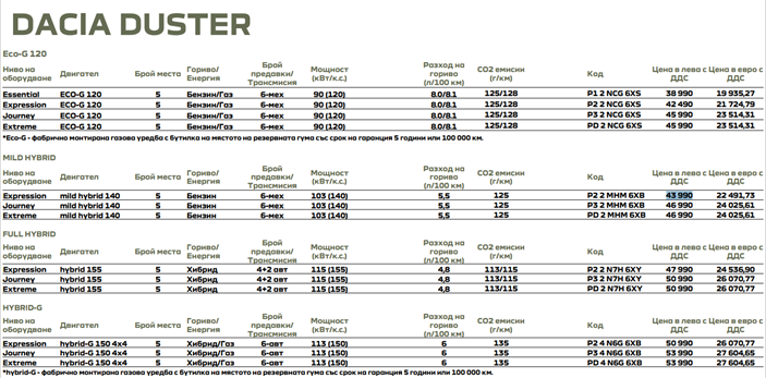 Новият двугоривен хибриден двигател hybrid-G 150 4x4 на Dacia вече може да се поръчва в България за моделите Duster и Bigster. Агрегатът се предлага за нивата Expression, Journey и Extreme на Duster на цени от 50 990 лв. (26 071 евро), а при по-големия Bigster стартовата цена е 56 990 лв. (29 139 евро). Първите доставки за български клиенти се очакват през първото тримесечие на 2026 г., съобщават от Dacia България.