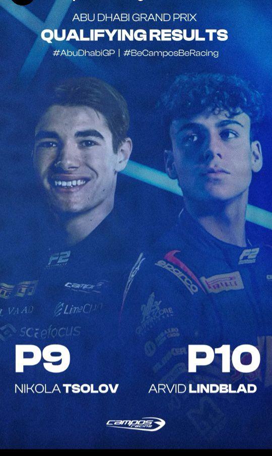 Страхотната адаптация на Никола Цолов към болидите от Формула 2 продължава и в Абу Даби. Българският лъв даде девето време (1:37,231 мин.) в квалификацията, което му гарантира втора позиция на старта в спринта в събота. Според правилата на Формула 2 първите десет най-бързи пилоти стартират в обратен ред.