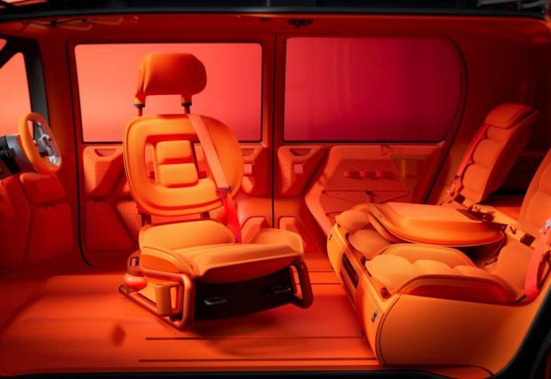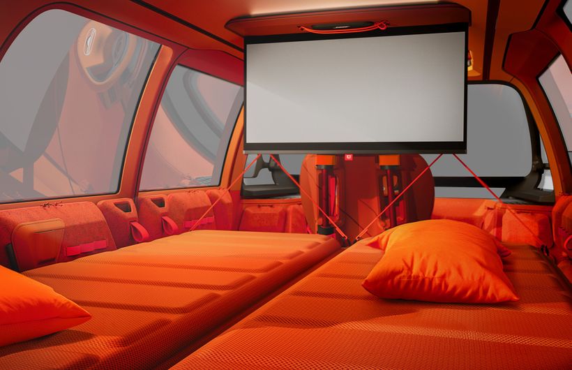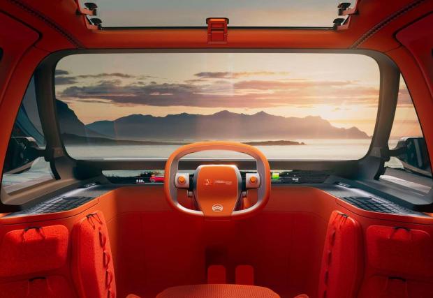 Хитрите детайли в интериора не се ограничават с това. Хедъп дисплей прожектира информация на под предното стъкло, а воланът е вдъхновен от този на “богинята” DS. Седалките могат да се свалят и да се използват за пикник, включително шофьорската! А на мястото на задните могат да се поставят две надуваеми легла. За тази цел на борда има компресор. При този вариант от тавана се спуска платно за прожектиране на филми. Става и за миниатюрен офис – шофьорската седалка може да се трансформира в мъничко бюро.