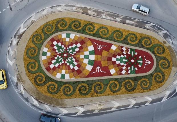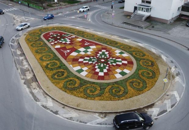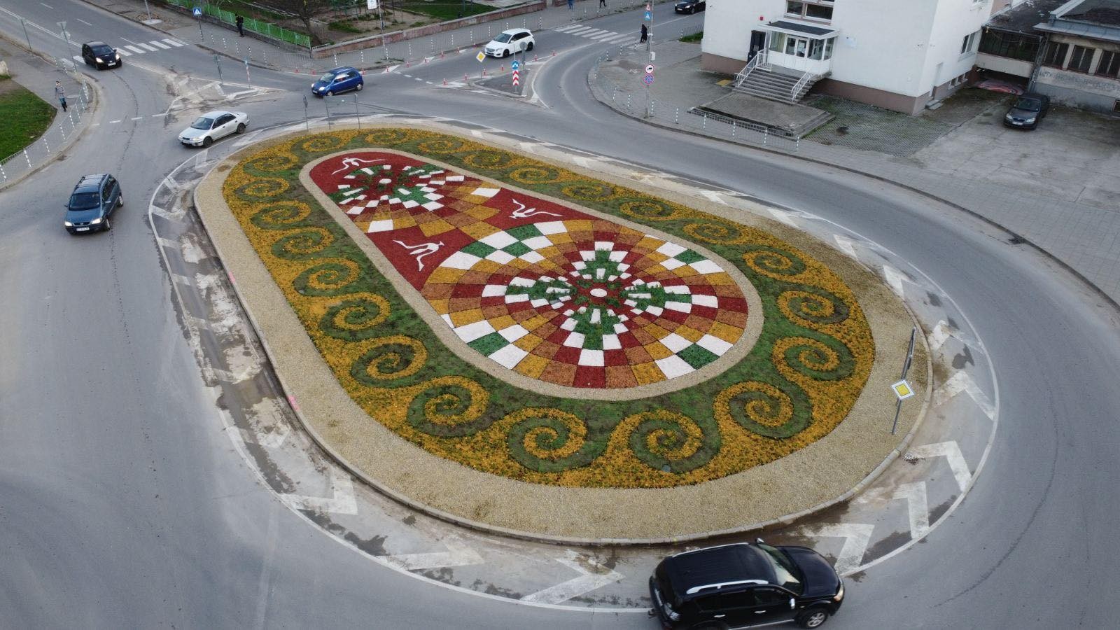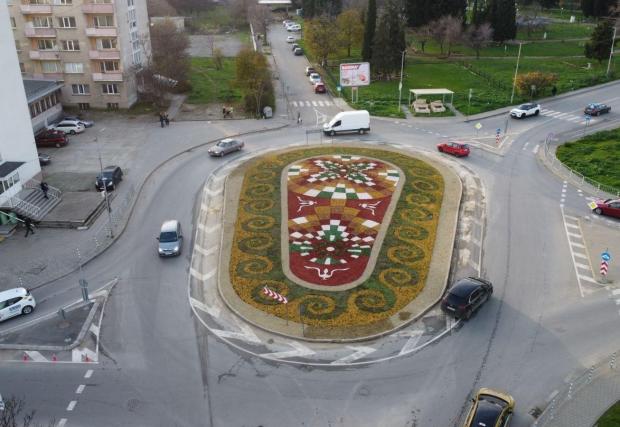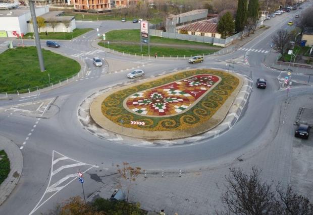 Кръговото кръстовище до парка “Зелен клин” в Стара Загора е завършено и изглежда впечатляващо. Дизайнът обединява елементи от два археологически източника, открити в Стара Загора: мозайките „Изворът на живота“ и „Дионисиево шествие“, които са символ на античната Августа Траяна.