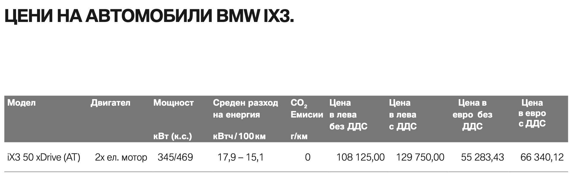 Цени. Засега, със старта на продажбите, моделът дебютира само под формата на iX3 50 xDrive и с цена започваща от 129 750 лв. Което означава, че в M Sport вариант става 137 836 лв., а в най-спортният M Sport Pro – 143 092 лв. Към средата на 2026 гамата ще се разшири с по-достъпни варианти, вероятно означени iX3 40 xDrive и iX3 40 sDrive, вторият само със заден ел. мотор, и двата с по-малка батерия от на 50-ката. Не е изключено и електрохимията да е различна, тъй като BMW разчита на два доставчика на клетки – EVE и CATL. В момента версията 50 xDrive е с първите, като в по-достъпните модели може да видим и LFP клетки (литиево-желязо-фосфатни) на CATL. По-напред във времето има вероятност да излезе и iX3 M60, както и iX3 M с над 800 к.с., но ще трябва да почакаме за да разберем.