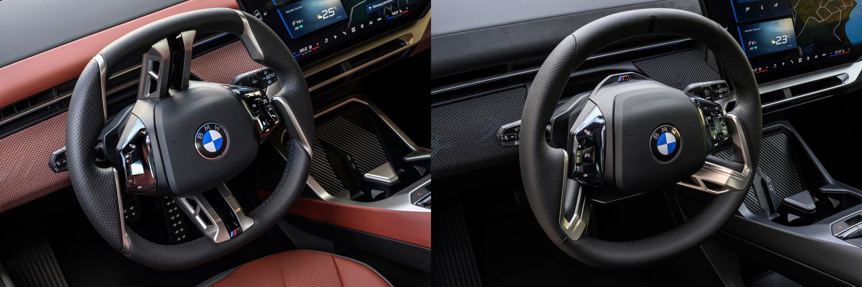 И стигаме до волана. Всъщност, те са три различни – базовият, който прилича много на този на M Sport, и леко бруталният M Sport Pro (наличен и като самостоятелна опция за 202 лв.). Последният, носещ значка М, ми прилича на зейналата паст на Хищника, удобен е за завиване, но не съм сигурен колко удобни са „тъч“ повърхностите за различните функции. От BMW казват, че са – може би ми трябва още време или пък наистина не са. Кормилото на M Sport обаче, като че ли буди най-крайните коментари. Наистина е странен с тези две огледално седящи една на друга спици, на 12 и 6 часа. Обръчите? Нетрадиционно тънки за BMW, което ми допада.