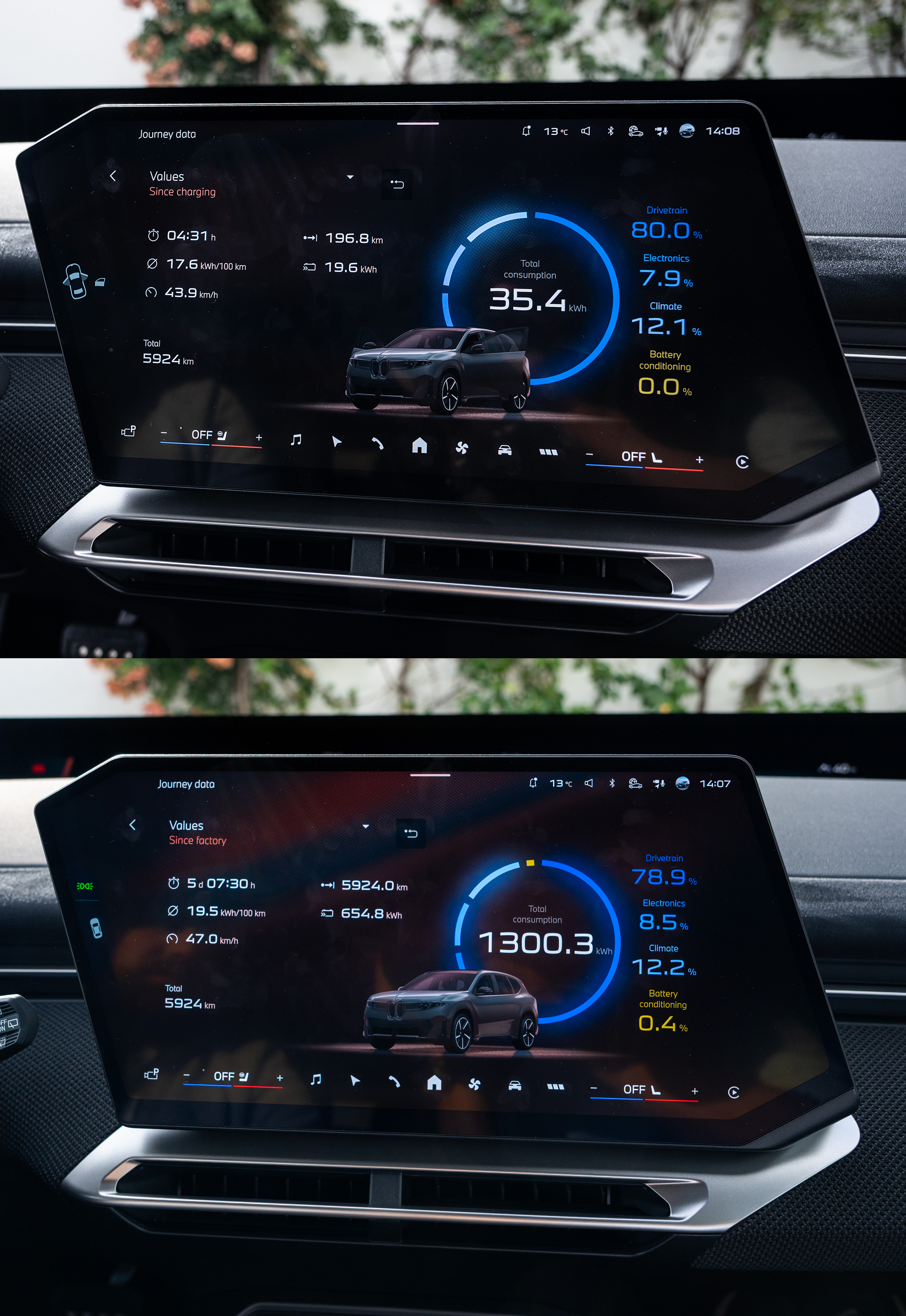 Пробегът? BMW твърдят, че iX3 е най-ефективният им EV и един от най-икономичните на пазара въобще. Обещават комбиниран разход от 17,9 – 15,1 кВтч/100 км и съответно 679-805 км с един заряд. Моят опит? Взех автомобила с показания 98% и 944 км възможен пробег и го карах 200 км, като маршрутът включваше всичко - магистрала, планински изкачвания и спускания, както и градско. Показанията в края на теста бяха 66% батерия и 656 км възможен оставащ пробег. Другите данни от това пътуване бяха разход 17,6 кВтч/100 км при средна скорост 44 км/ч. Тоест, разделяйки консумацията на използваемия капацитет на батерията, получавам 618 км реален пробег.