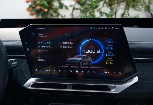Любопитно ми беше да разбера и данните за целия „живот“ на колата, който не бе много дълъг, предвид факта, че е предсериен екземпляр на вероятно бе произведен преди няма и месец. Извиках ги на бордовия компютър от менюто „От завода“, което показа километраж 5924 км за 5 дни и 7 часа шофиране. Средната скорост бе по-висока, 47 км/ч, както и разходът – 19,5 кВтч/100 км. Разделен на капацитета резултира в пробег от около 560 км.