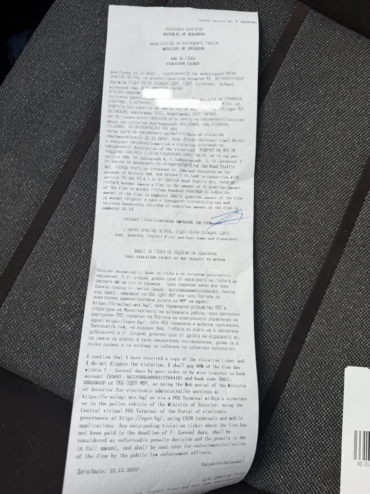 Във Facebook популярност набира пост на Деян Ганчев от София, който е бил глобен на Околовръстния път на София за прекалено мръсен регистрационен номер. Потърпевшият прилага и снимка от фиша за 100 лева (“петдесет и едно евро и тринадесет стотни”), както и снимка на действително доста мръсен Seat Tarraco.