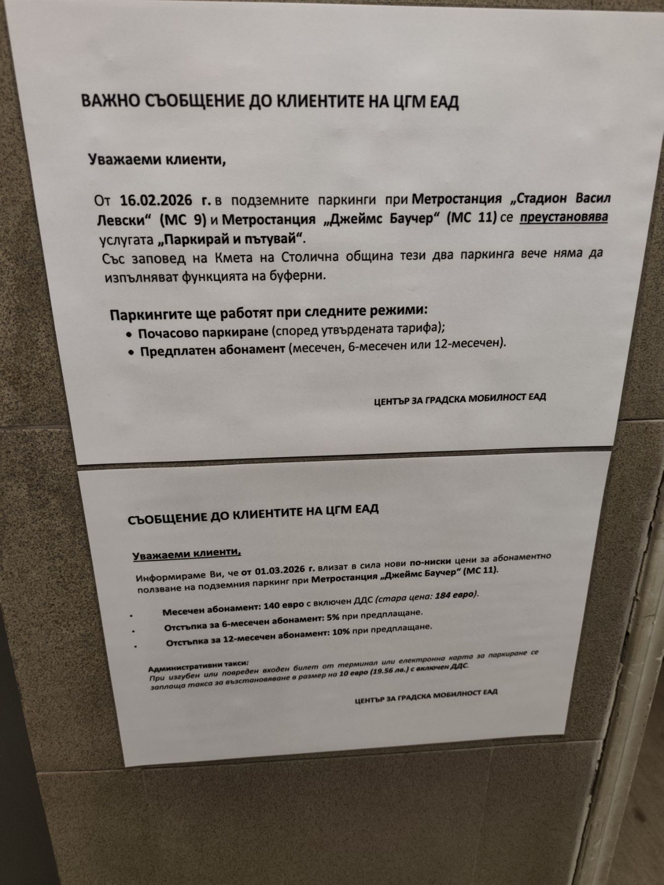 Разлепени листчета около метростанциите „Джеймс Баучер“ и „Стадион Васил Левски“ разпалиха напрежение сред шофьори, които комбинират автомобил и метро. Според текста на съобщенията от 16 февруари 2026 г. двата паркинга спират да изпълняват функцията „Паркирай и пътувай“ и преминават към почасово паркиране и абонаментни планове. Информацията се появи първо в социалните мрежи, а по-късно беше отразена и от медии, като се твърди, че служител на място е потвърдил промяната. Към момента на публикацията официално съобщение на сайта на Центъра за градска мобилност все още няма.