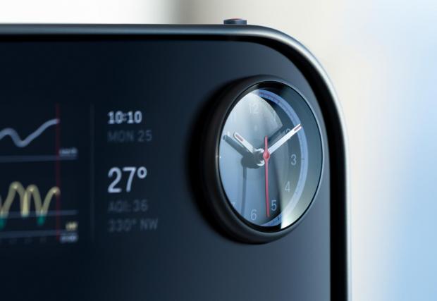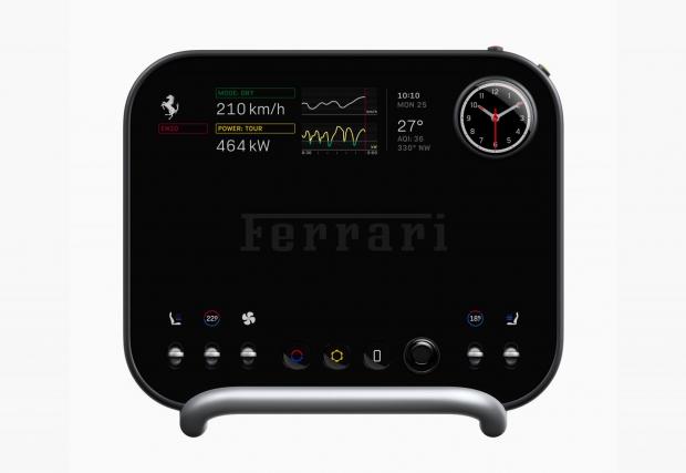 Подвижен е и централния дисплей, закачен с ябълковидна връзка за таблото, така че да може да се ориентира свободно или към водача или към пасажера. Друга забележителност при него е истинският часовник горе вдясно, който Ferrari наричат „мултиграф“. Този уред освен да показва часа, явно може да служи за хронограф, да се превръща в компас и индикатор на функцията лаунч контрол. „Произведение на изкуството на микро инженеринга“ пишат още в прессъобщението. Изглеждащото супер класически уредче си има три собствени електромотора, движещи стрелките автономно.