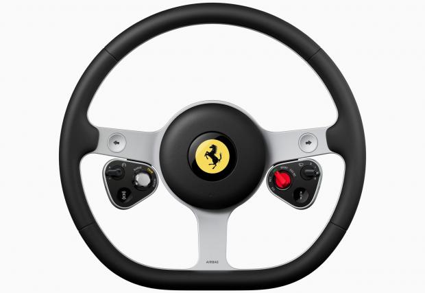 Самият волан също изглежда минималистичен, макар и да разполага с две конзоли с бутони, управляващи сложни функции на колата. Обръчът и спиците са алуминиеви и от марката казват, че волана е с 400 грама по-лек от този на „нормално“ Ferrari. Апликациите в самото табло, там където са и въздуховодите, също изглеждат като от сплав на лекия метал, но за тях не пише нищо.