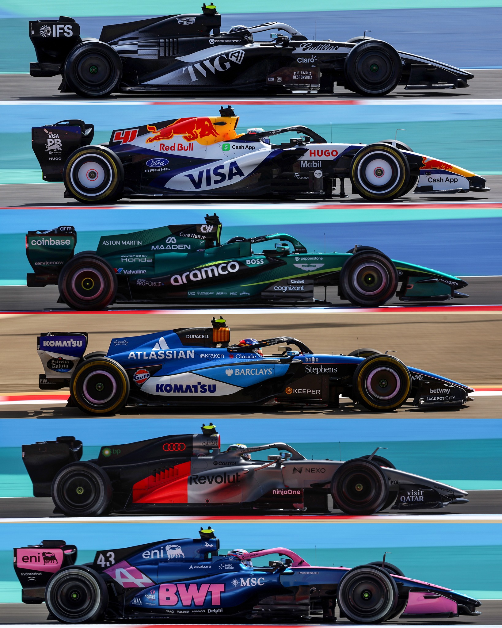 В галерията над текста може да видите всеки от новите болиди по време на първия ден от тестовете в Бахрейн. Това обяснява аеро боята и елементите по някои от колите.