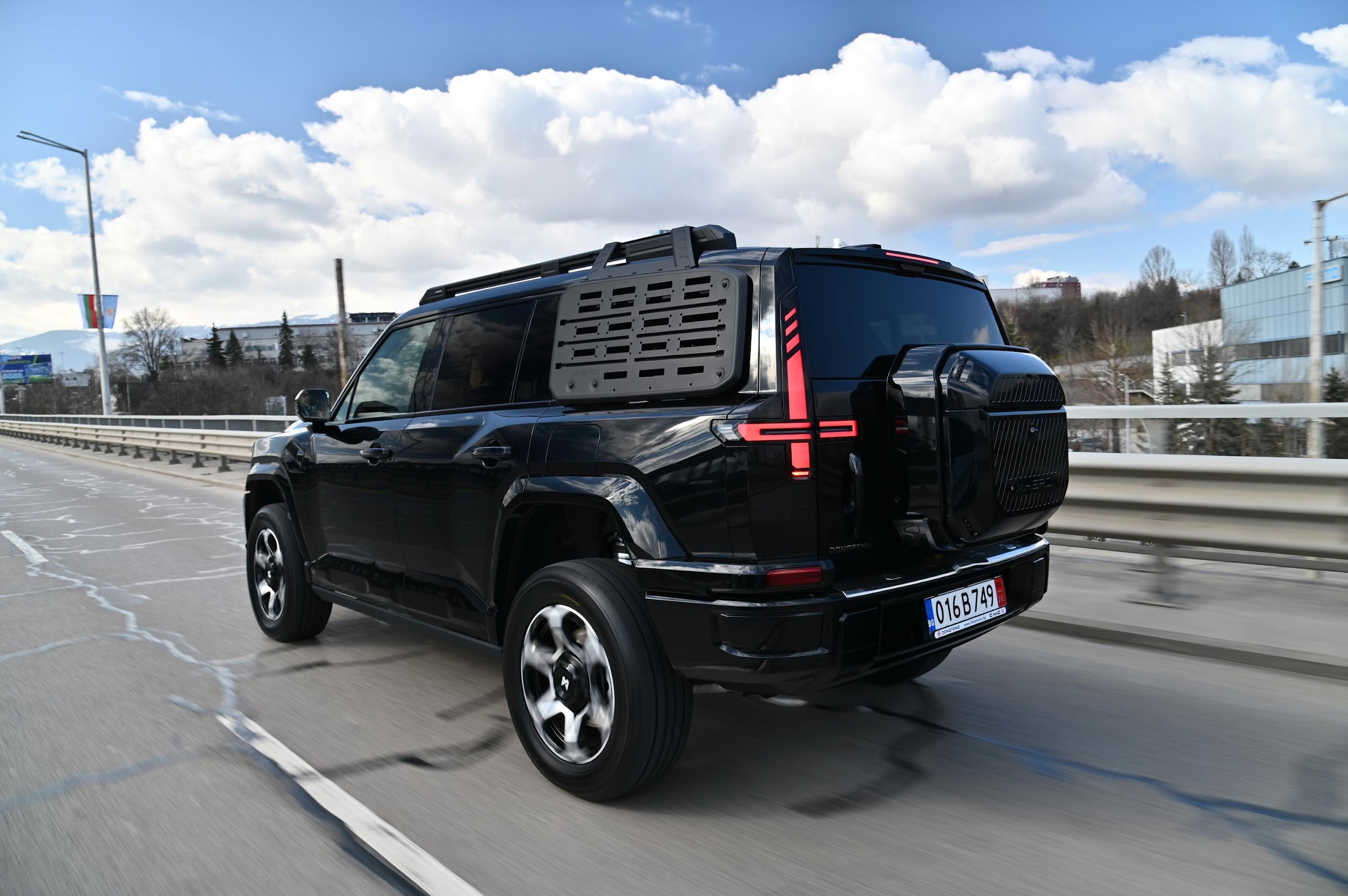 У нас колата се предлага и в две нива на оборудване – Е0 и E1+. Първата се води по-базова и с фокус, върху офроуда, докато втората е подчертано по-луксозна, макар че и тя е доста способна извън пътя, както се убедих сам. Е1+ идва с въздушно окачване и впечатляващата функция “Crab Walk”, при която задните колела завиват в същата посока, като предните и колата тръгва настрани, 20-инчови джанти, тапицерия от истинска кожа (яко изпълнение), хедъп дисплеи, дисплей на втория ред и ще доста глезотийки.