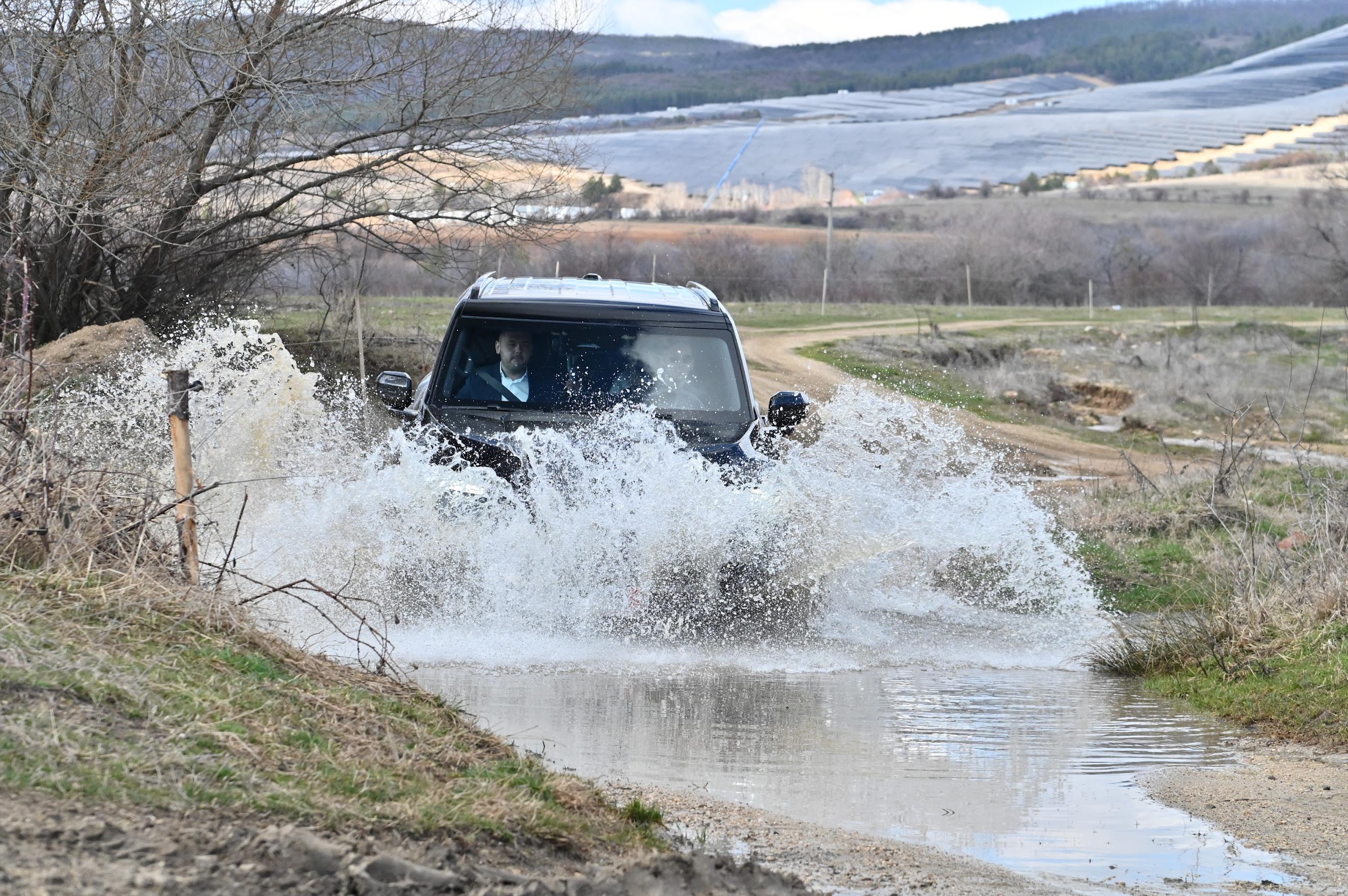 Учудих се с каква лекота колата намира сцепление в дълбоката кал и как е способна да завие почти на място. Навиваш пълен волан, даваш газ, колата продължава направо няколко секунди, след което сякаш някой я хваща и я поставя да сочи в посоката, в която искаш. Тази магия се дължи и на завиващите с около 10 градуса задни колела. E0 пък може да се поръча и с блокажи на всички дифове, което би следвало да я направи още по-проходима.