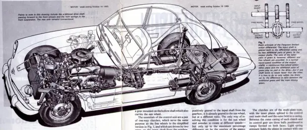 Технологията на системата за задвижване на четирите колела на Jensen FF е свърхавангардна за времето на представянето си през 1965 година. Тя е плод на идея на пилотите Тони Ролт и Фреди Диксън и основите и могат да се открият още преди Втората Световна Война. След войната Ролт и Диксън се срещат с производителя на трактори Хари Фергюсън. По това време той е продал компанията Massey Ferguson и има достатъчно средства за инвестиции. Фергюсън прегръща идеята за създаване на система за постоянно задвижване на четирите колела на автомобил и през 1950 година е създадена компанията Harry Ferguson Research. Нещата обаче не се случват по оптимистичния сценарий – на практика никой масов производител не се интересува от създадената от Фергюсън система, принципно проектирана за задвижване на трактори. За да демонстрира смисъла на технологията Тони Ролт отива в другата крайност – интегрира системата в автомобил от Формула 1. Ferguson P99 с 1,5 литров двигател Coventry-Climax се състезава във Формула 1 само веднъж (през 1966 година), но пък печели едно състезание извън нея. BRM също прави опит да създаде конкурентен автомобил с двойно предаване, но се отказва още в само начало заради необещаващите резултати.