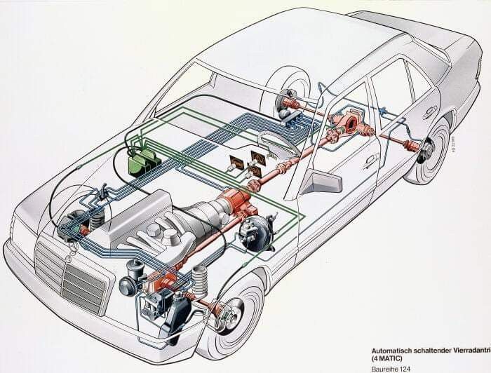 Като изключим класическото двойно предаване с междуосев диференциал и три блокировки на G-класата, Mercedes стартира одисеята си с екзотичното и сложно двойно предаване на W124 през 1987 година с планетарен междуосев диференциал и два набора от многодискови съединители (един за активиране на предаването на въртящ момент към предния мост и един за блокиране на диференциала), позволяващи движение само със задния мост, постоянно 4х4 с разпределение 37:63 и с блокиране 50:50 в зависимост от ситуацията. При необходимост със съединители се блокира задния диференциал. Характерна особеност на този модел са и специфичните спирални пружини на предния мост, през които преминават предните полуоси. След тази система Mercedes премина и се задържа дълго време върху архитектурата с планетарен междуосев диференциал при двигателите с надлъжно разположен двигател, базирани на двойно предаване, с различни форми на блокиране, за да премине в наши дни отново към междуосеви съединители.
