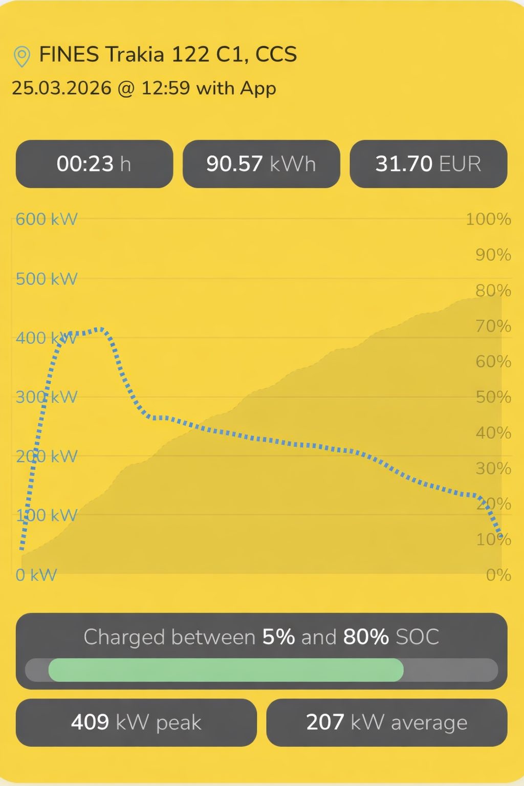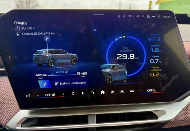 Шофьорът на iX3 пише в групата “Собственици на електромобили в България”, че е заредил от 5 до 80% за 23 минути със средна мощност 207 кВт, което също не е лошо постижение. Според официалните данни на BMW пиковата мощност на зареждане на iX3 при идеални условия е 400 кВт.