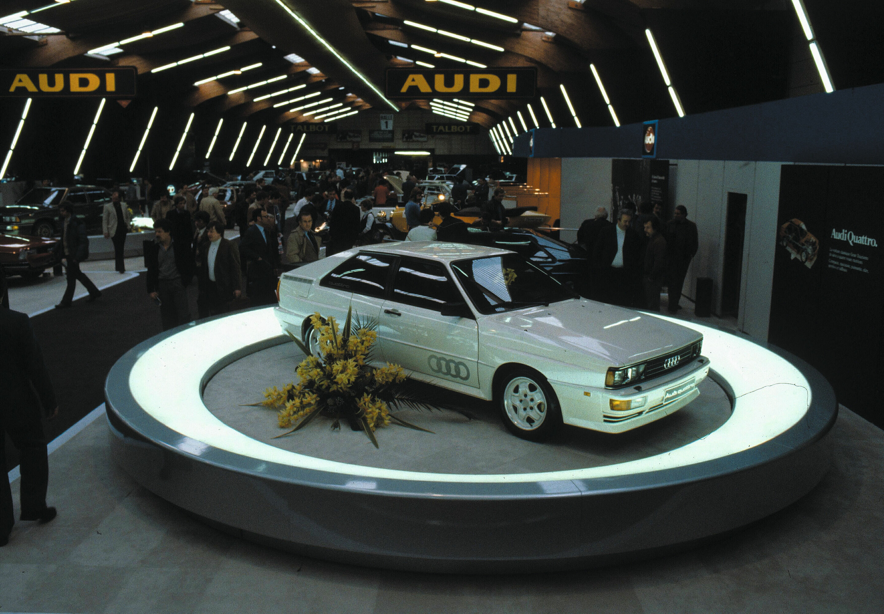 На 3 март 1980 година боядисаният изцяло в бяло прототип, създаден на базата на Audi 80 Coupe, но с доста по-ъгловати форми, е представен на изложението в Женева, а Фердинанд Пийх многозначително отбелязва „Това е раждането на двойното предаване в леките автомобили.”