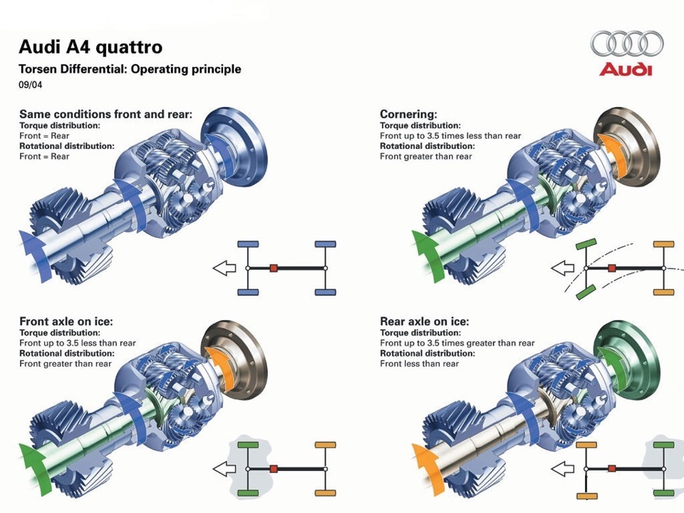 Този „антипод“ на системата ESP (при която се прилага различно спирачно усилие към избрано колело) може да помогне, както за стабилизиране на автомобила чрез активно „завъртане“ около централната ос и компенсиране на склонността към презавиване или недозавива, така и да създаде условия за по-динамично шофиране в завой, с прилагане на по-голям въртящ момент към външното задно колело. Изглежда ви познато ли – да, система за прилагане на различен въртящ момент към някое от колелата се използва още от 1996 година – пионер в това отношение са Mitsubishi с Lancer Evolution IV и Honda с Prelude. Втората еволюира в по-късната Super Handling All Wheel Drive, въведена през 2005 година в Legend. Базирани на допълнителни планетарни механизми и съединители тези системи после са усъвършенствани съвместно от инженерите на Audi (Quattro with Sport Differential) и BMW и техни партньори като Borg Warner и ZF. Всички тези системи, обаче са изцяло механични (електричество се използва само за изпълнителни механизми, като тези задействащи съединителите) и, същевременно с това и различни, от самоблокиращите или блокируемите диференциали, които създават частична връзка между компонентите на диференциала, но запазват предаването на един и същ въртящ момент в случаите на осев (колесен) диференциал. Не са редки случаите на спортни автомобили като Audi RS3 (Torque Splitter), Ford Focus RS или Opel Insignia GSi, при които осевият диференциал изцяло отпада и се заменя от два набора от съединители осигуряващи различен въртящ момент към двете колела. Преди да опишем обаче как работят тези механизми, нека се върнем малко назад в историята на създаването на Quattro от Audi.