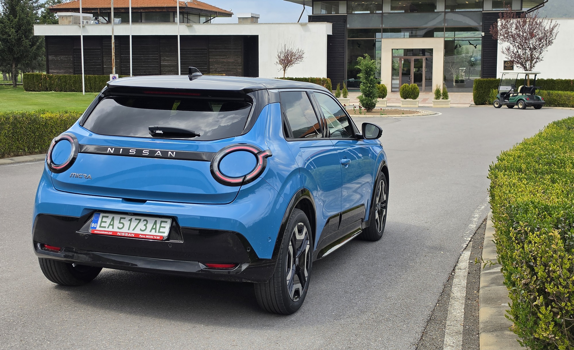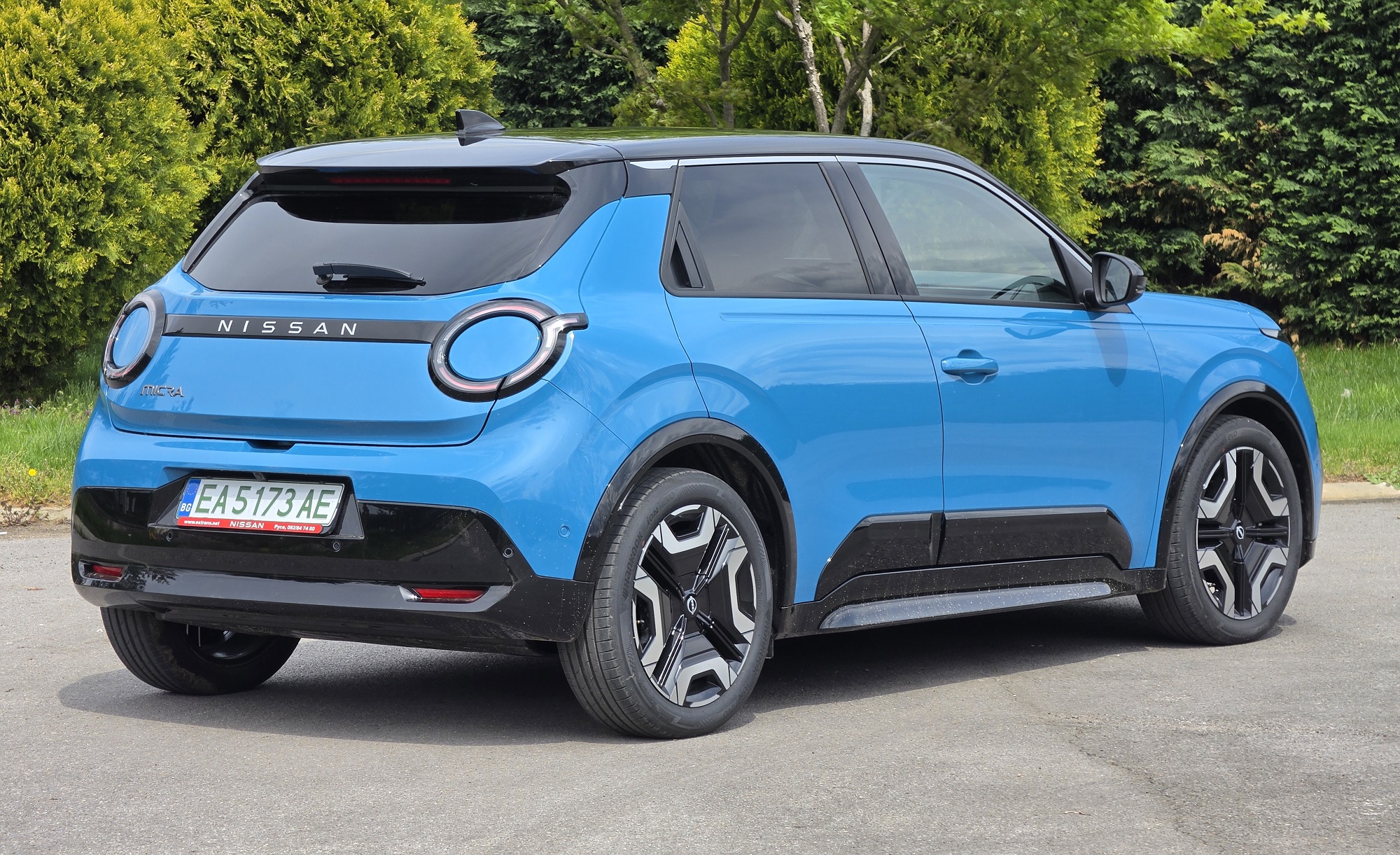 Отвън Micra изглежда свежо, стегнато и доста по-уверено стъпила на пътя, отколкото бихме очаквали от класически градски модел. Формата е компактна, но с ясно подчертани калници, по-високо „чело“ и детайли, които ѝ придават почти кросоувър излъчване, а най-силен акцент са характерните кръгли светлинни елементи около основните фарове. Именно тук личи и най-голямата разлика с Renault 5 – французинът залага много по-директно на ретро прочита на оригиналната „петица“, докато Micra е по-скоро интерпретация в стила на Nissan, с по-масивна стойка, по-изразени „рамене“ и по-сдържана, но по-самоуверена визия.